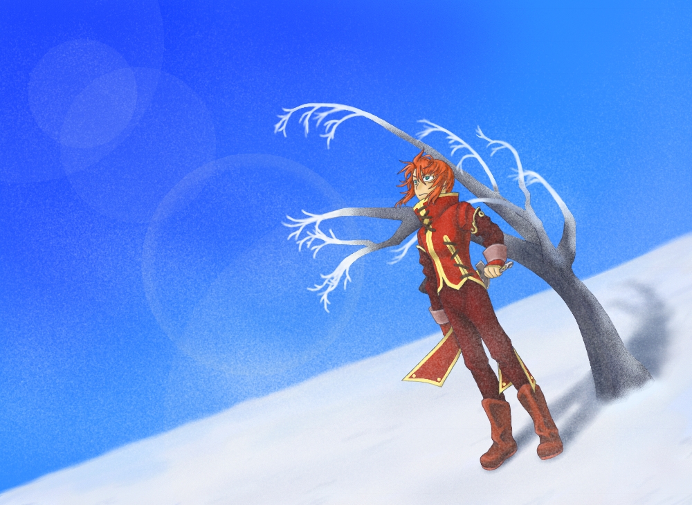 晴れ渡った雪原に赤い服。
